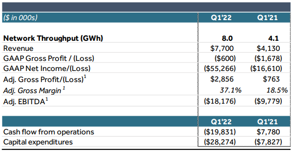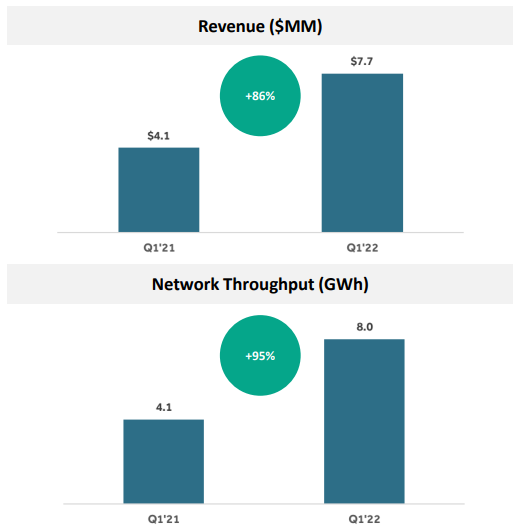 - 미국 도로의 EVC가 EVgo의 급속 충전 솔루션에 대한 수요를 지속적으로 견인함에 따라, 22분기 네트워크 처리량은 8.0GWh로 1'21분기 대비 95% 증가했습니다.