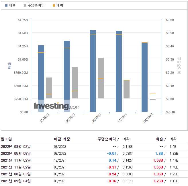 이 회사는 2021년 같은 기간에 주당 0.06달러의 이익을 낸 것에 비해 가장 최근 분기에 주당 0.01달러의 순 손실을 보고했습니다. 조정되지 않은 기준으로 5,960만 달러 또는 0.13달러의 순 손실을 입었습니다. 3개월 동안 주당 순이익은 7,780만 달러 또는 주당 0.17달러였습니다.