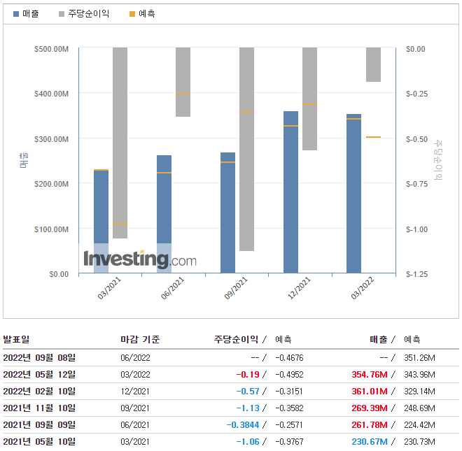 - 영업손실은 2021년 11월 아마존에 부여된 워런트 관련 비용 1억240만 달러가 포함된 영업·마케팅에 대한 지속적인 투자로 2021회계연도 3분기 2억930만 달러 대비 2억2660만 달러였다. 매출액 및 마케팅 비용 증가분을 일부 상쇄한 것은 2021년 1월 회사 공모로 인한 주식기준보상비 상승 등이 포함된 전년 대비 주식기준보상비가 8,130만 달러 감소한 것이다.