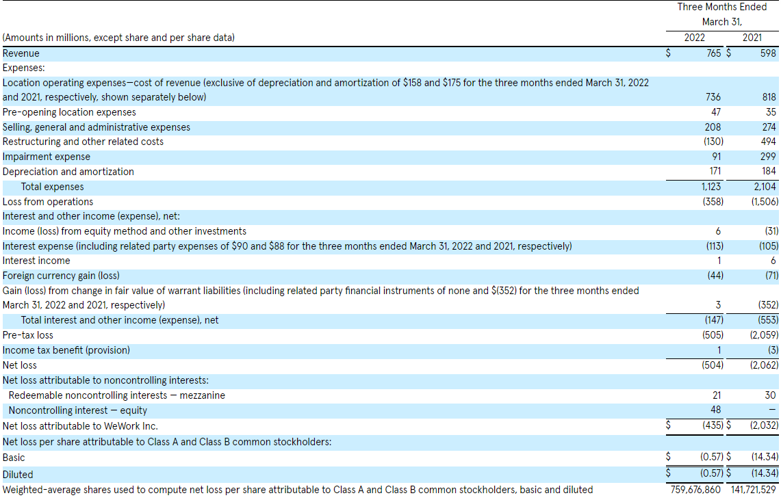 WeWork는 2022년 1분기에 7억 6천 5백만 달러의 수익을 보고했는데, 이는 7억 4천만 - 7억 6천만 달러의 가이드 레인지의 하이엔드보다 높은 수치입니다.
