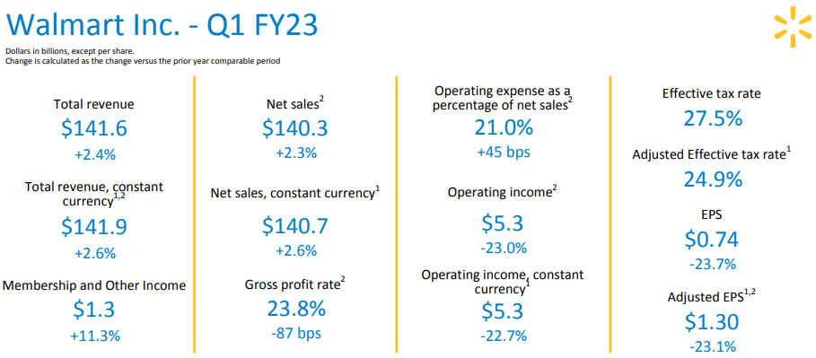 - 연결총이익률은 샘스클럽과 미국 월마트에서 공급망 비용과 제품 조합 상승으로 인해 87 베이시스 포인트 하락했습니다.