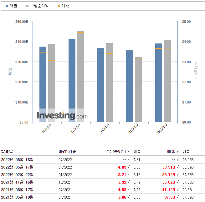 1분기 순이익은 2021년 같은 기간 41억5000만 달러(주당 3.86달러)에서 42억3000만 달러(주당 4.09달러)로 늘었다.분석가들의 추정치를 넘어서는 것도 최근 수치다.