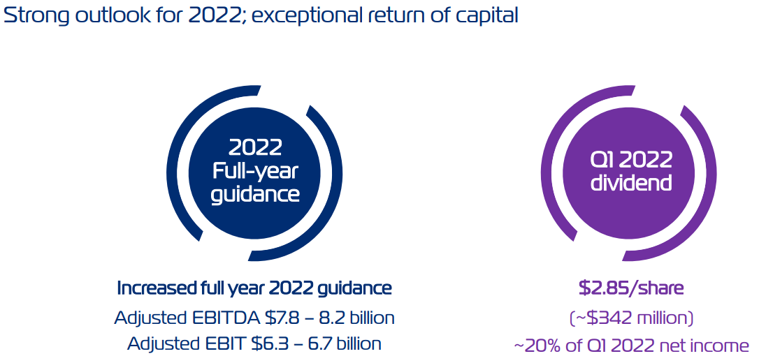 이 회사는 이전에 제공된 2022년도의 지침을 늘렸으며 현재 78억 달러에서 82억 달러 사이의 조정된 EBITDA와 조정된 EB를 창출할 것으로 예상하고 있습니다.IT는 63억 달러에서 67억 달러 사이입니다.