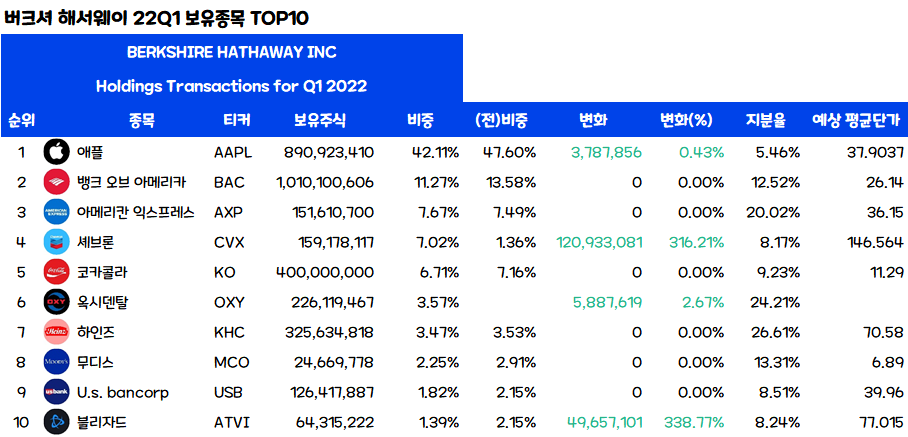 과연 버크셔 해서웨이의 22Q1 보유종목 TOP10은 무엇일까요?