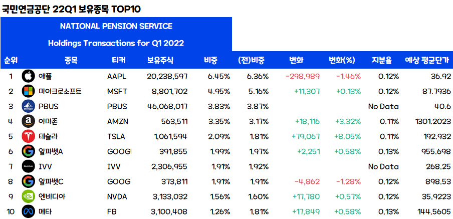 과연 국민연금공단의 22Q1 보유종목 TOP10은 무엇일까요?