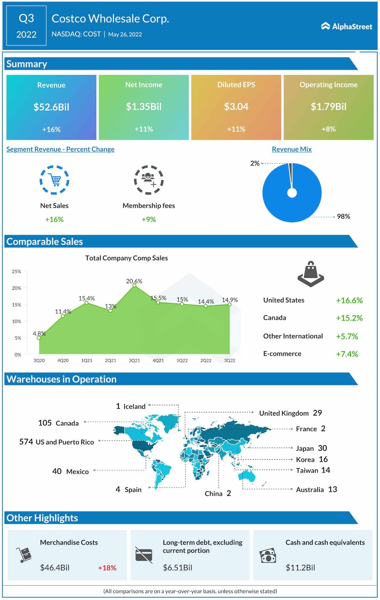 코스트코 도매공사("코스트코" 또는 "회사")(나스닥: 코스트)는 오늘 3분기(12주)의 영업성과를 발표하였고, 2022 회계연도 첫 36주가 2022년 5월 8일에 종료되었다.