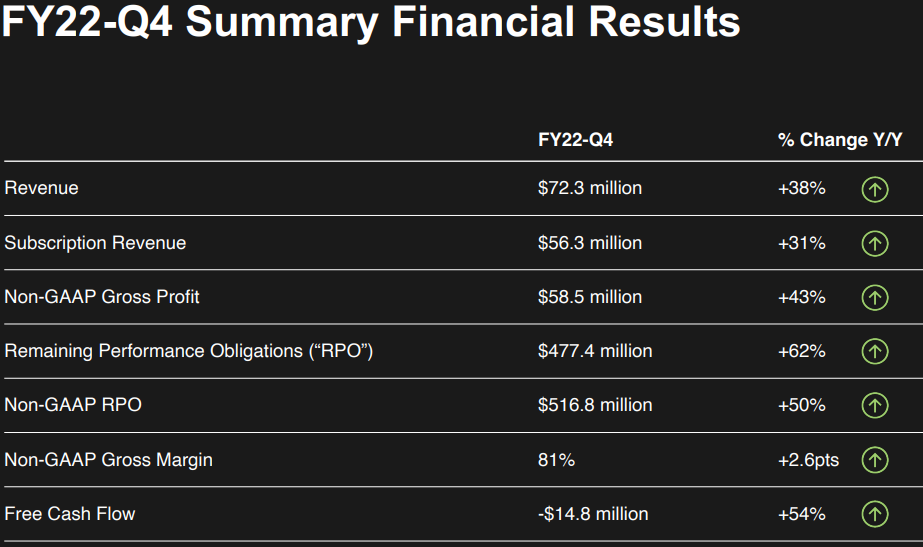 - 잔여 성과 의무("RPO") : GAAP RPO는 1년 전 2억 9,380만 달러에서 62% 증가한 4억 7,740만 달러입니다. 중요한 것은 GAAP RPO가 4분기 연간 매출의 165%로 증가했다는 것입니다. 비GAAP RPO는 50% 증가한 5억 1,680만 달러로 1년 전의 3억 4,510만 달러에서 증가했습니다.
