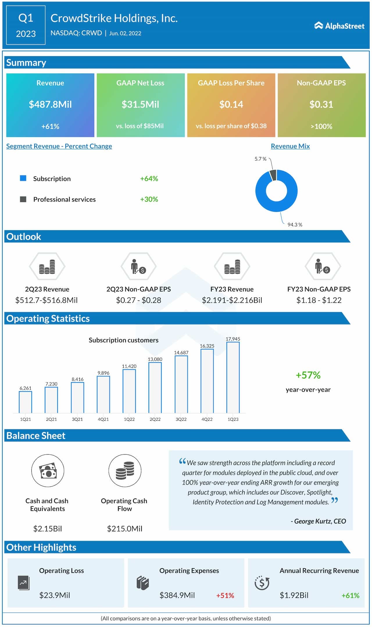 - 수익: 총수입은 4억8780만달러로 2022회계연도 1분기 3억2280만달러에 비해 61% 증가했다.구독 수익은 4억5천980만달러로 2022회계연도 1분기 2억8천120만달러에 비해 64% 증가했다.