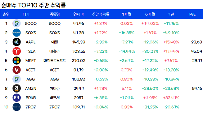 이번주는 대체로 상승장이였습니다. 나스닥100 ETF QQQ의 3배 인버스 SQQQ가 1위를 하였습니다.