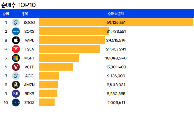 안녕하세요? Stock Simple, 씸플입니다. 05.21~05.27 순매수 TOP10, 씸플요약입니다. 1. 테슬라 1위는 역시나 압도적으로 테슬라입니다. 부동의 1등 같습니다. 변함없죠. 2. TQQQ 2위로는 TQQQ입니다. 나스닥 1