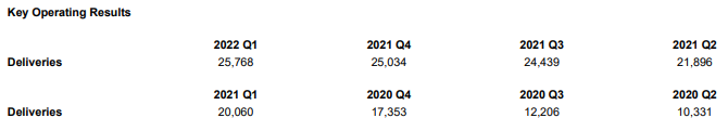 - 2022년 1분기 차량 인도량 은 25,768대로 ES8 4,341대, ES6 13,620대, EC6 7,644대, ET7 163대로 2021년 1분기 대비 28.5%, 2020년 4분기 대비 2.9% 증가했습니다.