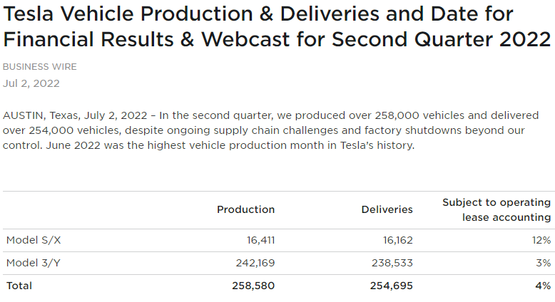 텍사스 오스틴, 2022년 7월 2일 – 2분기에 우리는 258,000대 이상의 차량을 생산하고 254,000대 이상의 차량을 인도했습니다.