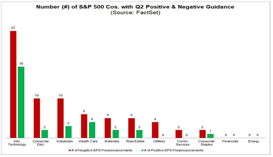 - 반면 정보 기술 부문은 2분기 플러스 EPS 가이던스(18개)를 발표한 기업 수가 가장 많습니다.