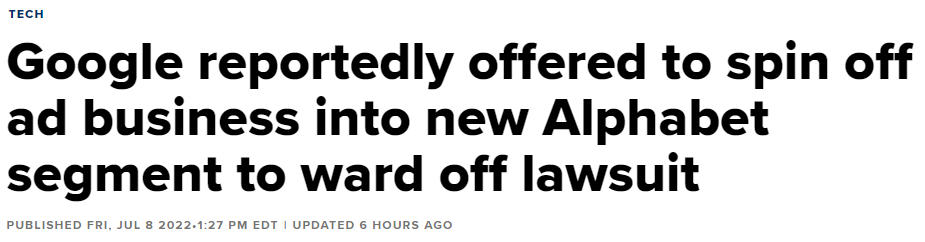 [구글은 소송을 피하기 위해 광고 사업을 새로운 알파벳 부문으로 분사하겠다고 제안한 것으로 알려졌다.]