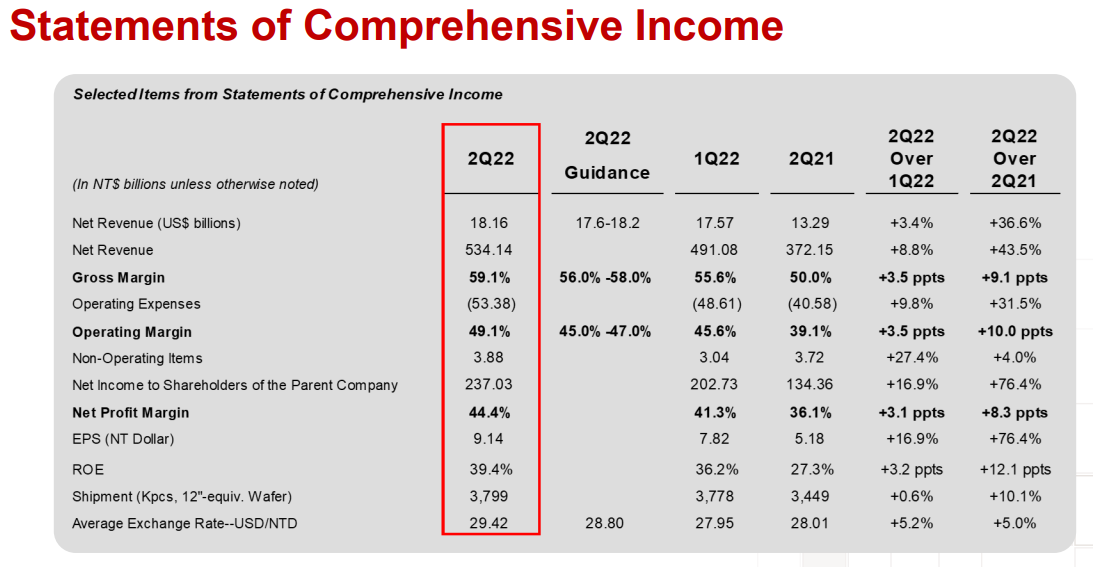 22년 7월 14일 TSMC( NYSE: TSM)는 오늘 2022년 6월 30일에 종료된 2분기 연결 매출 5,341억 4천만 대만달러, 순이익 2,370억 3천만 대만달러, 희석 주당 이익 9.14 대만달러(ADR 단위당 1.55달러)를 발표했습니다.