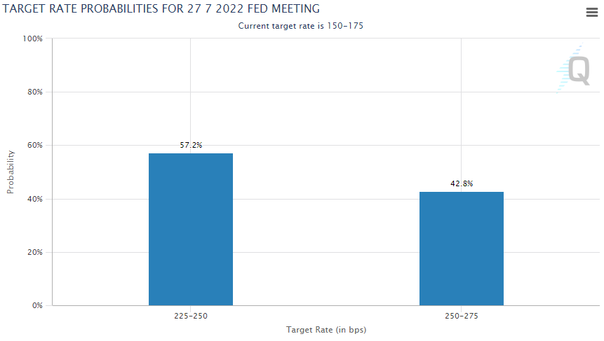 CME FedWatch 100bp 인상 확률 42.8%로 감소, 75bp 인상 확률 57.2%증가