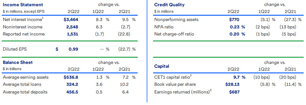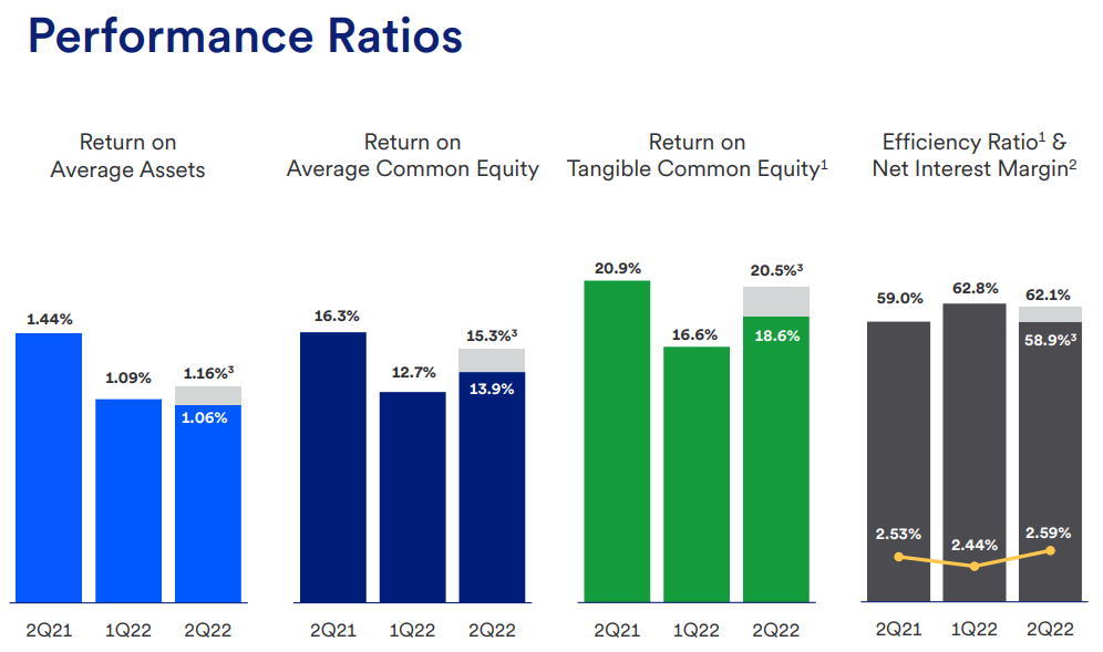 - 평균 자산 수익률은 1.06%이고 평균 보통주 수익률은 13.9%입니다. 합병 및 통합 관련 비용을 제외하고, $1,684M의 순이익, 1.16%의 평균 자산 수익 및 15.3의 평균 보통 자본 수익%
