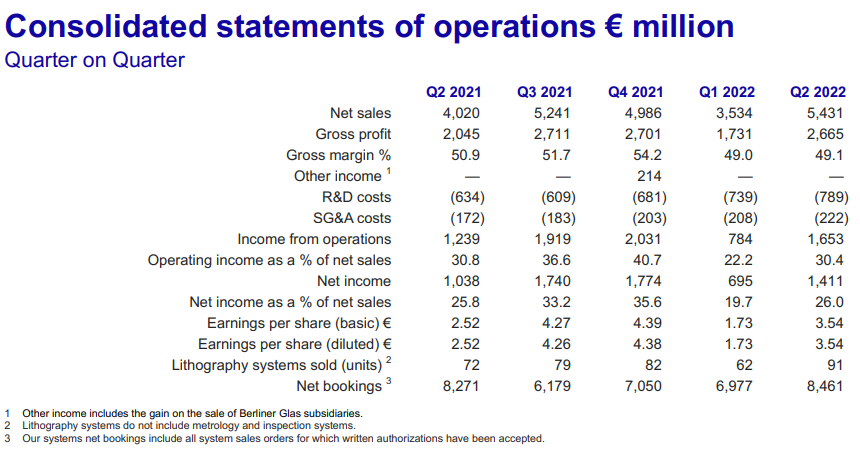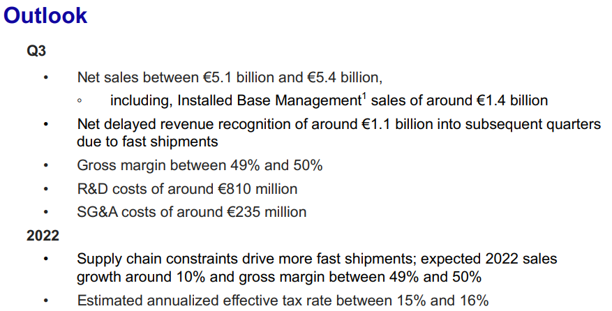 - ASML은 2022년 3분기 순매출액이 51억유로에서 54억유로 사이, 총이익이 49%에서 50% 사이일 것으로 예상하고 있습니다.