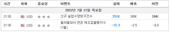 - 미국 최초 실업수당 청구 실제 251k(예측 240k, 이전 244k)