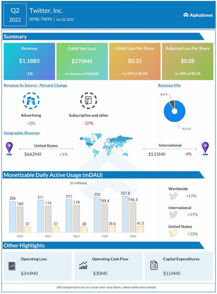 - 트위터 인수 보류와 관련된 비용은 2분기에 약 3300만 달러였다.