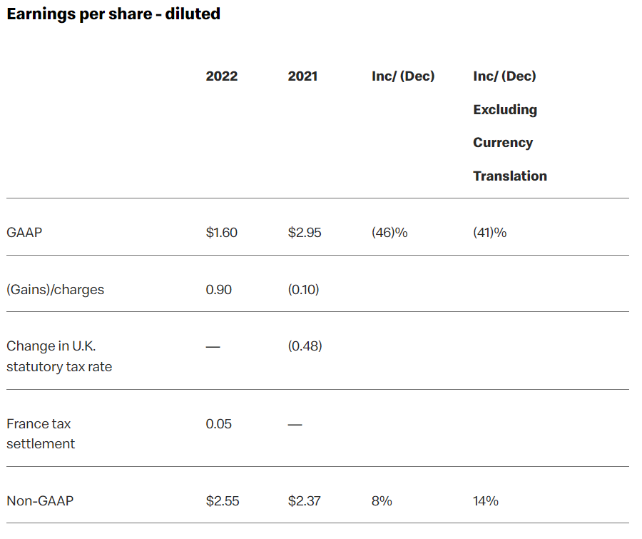 - 희석 주당 순익은 $1.60로 46% 감소했습니다(불변 통화 기준으로 41%). 위에서 설명한 주당 $0.90의 순 비용과 프랑스의 세무 감사 결산과 관련된 주당 $0.05의 비영업 비용을 제외하면 해당 분기의 희석 주당 이익은 $2.55로 8% 증가했습니다(불변 통화로 14%). , 주당 $0.10의 전년도 순 세전 이익과 주당 $0.48의 소득세 혜택도 제외됩니다.**