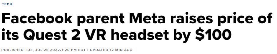 페이스북의 모기업인 메타는 회사가 인플레이션 압력을 고려함에 따라 Quest 2 가상현실 헤드셋의 가격을 100달러 인상했다.