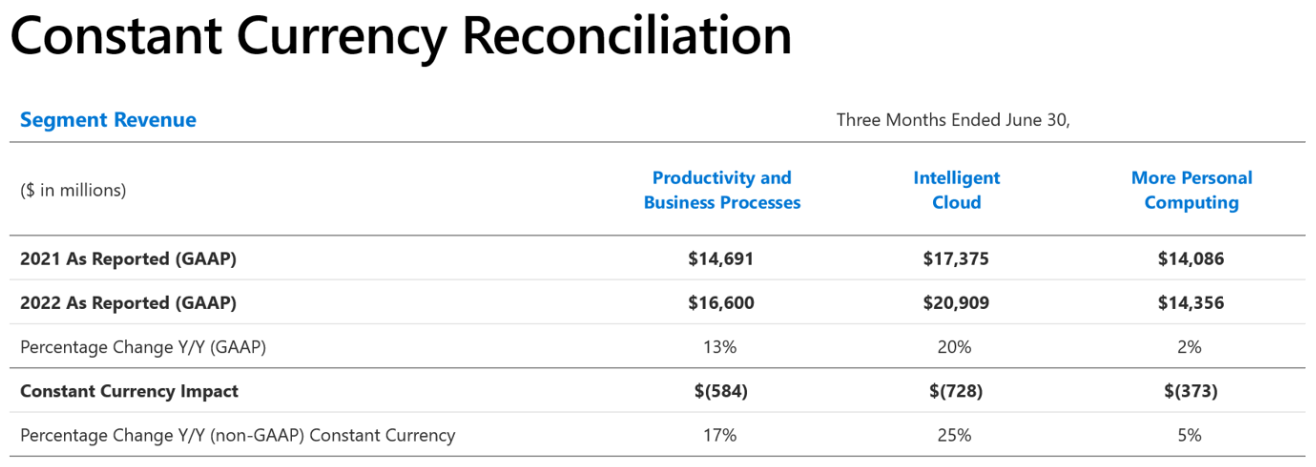 - 서버 제품 및 클라우드 서비스 매출은 Azure 및 기타 클라우드 서비스 매출 40% 증가(항상 통화 기준 46% 증가)로 인해 22%(항상 통화 기준 26% 증가)