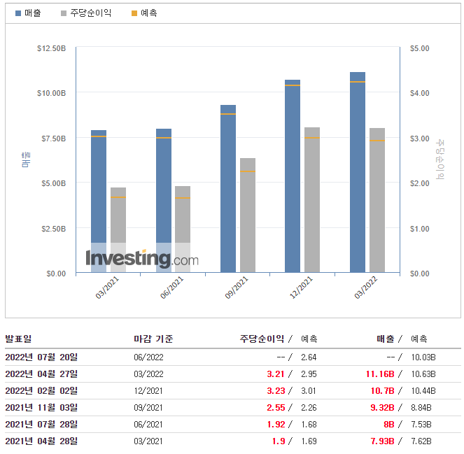 순이익은 29억3000만달러(주당 2.57달러)로 2021년 2분기 17억6000만달러(주당 1.53달러)에 비해 크게 늘었다.조정이익은 지난해 주당 1.90달러에서 주당 3.21달러로 올라 스트리트 뷰에서 1위를 차지했다.