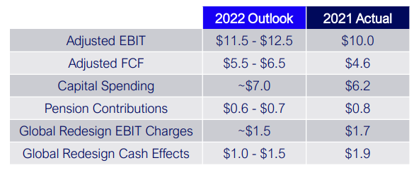 - 전체 연도 2022년 결과에 대한 지침 확인: 조정된 EBIT 비용 115억~125억 달러, 2021년에 비해 15%~25% 증가, 무상 현금 흐름 55억~65억 달러 조정