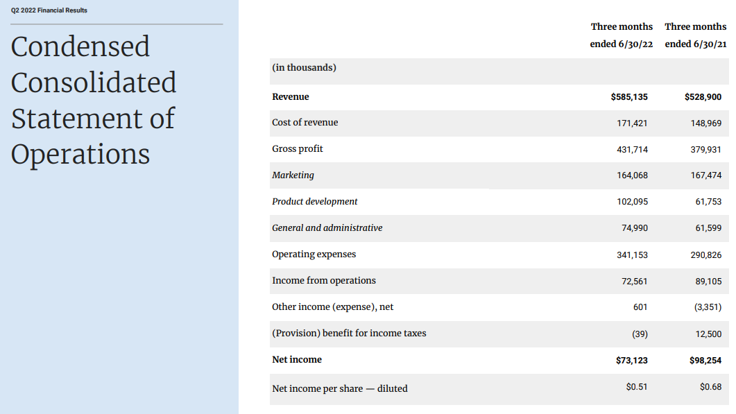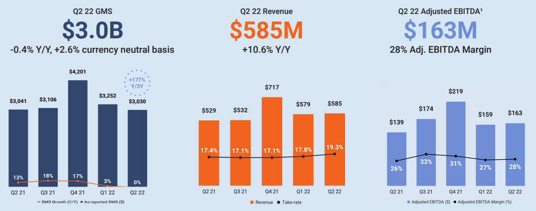 - 연결 수익은 2021년 2분기 대비 10.6% 증가한 5억 8,510만 달러였으며 테이크 비율(즉, 연결 수익을 연결 GMS로 나눈 값)은 19.3%입니다. 이 수익 실적은 2022년 4월 11일에 발효된 Etsy 마켓플레이스 거래 수수료 인상을 반영합니다.