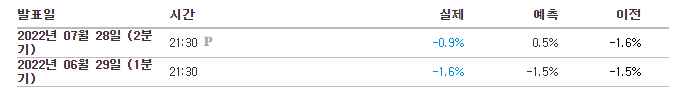 - GDP 발표 : -0.9% vs (예측 0.5%, 이전 -1.6%)