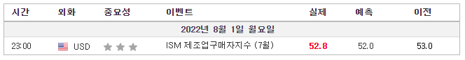 - 미국 ISM 제조업 PMI 실제 52.8(예측 52, 이전 53.0)