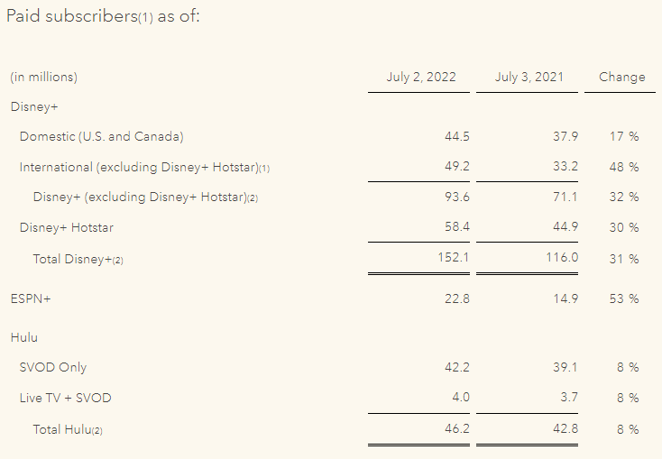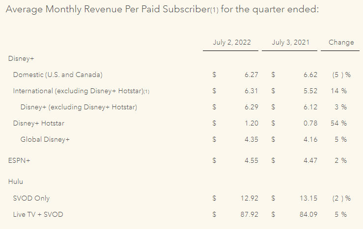 - 국내 Disney+의 유료 가입자당 평균 월 수익은 소매 가격 인상으로 부분적으로 상쇄된 다중 제품 제공 가입자 증가로 인해 $6.62에서 $6.27로 감소했습니다.