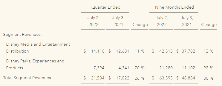 - 더 높은 비용은 주로 볼륨 증가로 인한 것이었고, 비용 인플레이션 및 새로운 게스트 제공. 국내 공원과 리조트는 이번 분기 전체에 개방된 반면, 디즈니랜드 리조트는 전년도 분기의 65일 동안, 월트 디즈니 월드 리조트는 전년도 분기에 축소된 수용 인원으로 운영되었습니다.