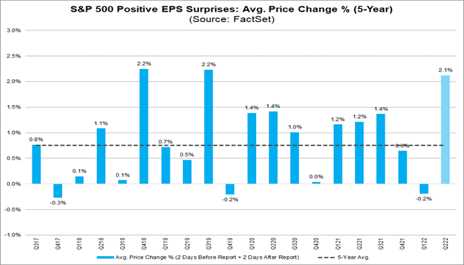 - 2022년 2분기에 긍정적인 어닝 서프라이즈를 보고한 기업들은 실적 발표 이틀 전부터 실적 발표 후 이틀까지 평균 가격이 2.1% 상승했습니다.