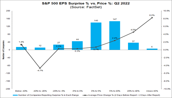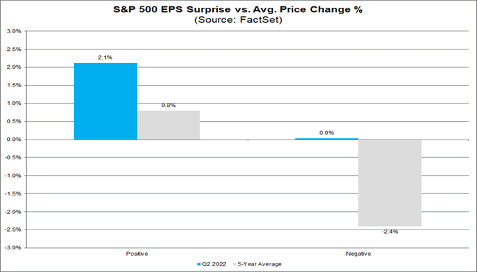 - 5년 평균에 비해 이러한 저성과를 감안할 때, 시장은 2분기 어닝 시즌 동안 S&P 500 기업이 보고한 긍정적이고 부정적인 EPS 서프라이즈에 어떻게 대응했습니까?