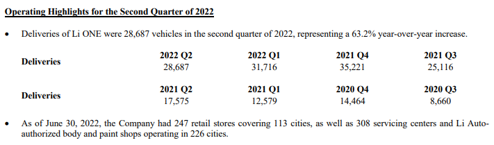 - Li ONE의 2022년 2분기 인도량은 28,687대로 전년 동기 대비 63.2% 증가했다.