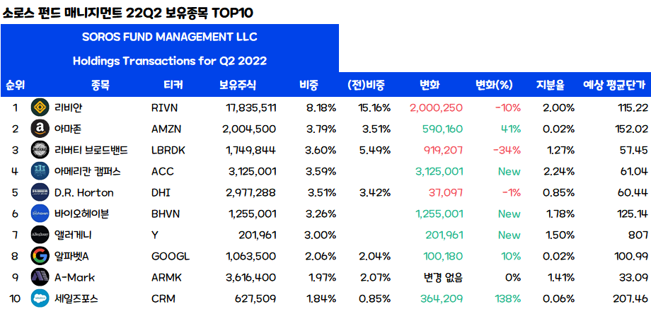 과연 소로스 펀드 매니저먼트 22Q2 보유종목 TOP10은 무엇일까요?