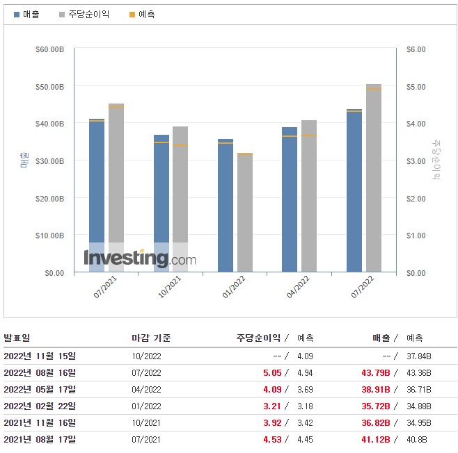 - 2021 회계연도 같은 기간의 순이익이 48억 달러(희석주당 4.53달러)인 데 비해 2022 회계연도 2분기 순이익은 52억 달러(희석주당 5.05달러)로 11.5% 증가했다.