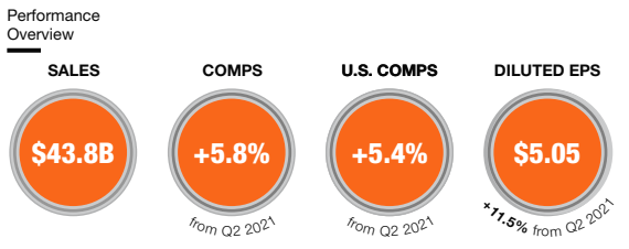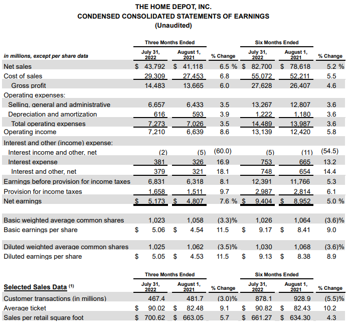 - 세계 최대 주택 개선 소매업체인 홈 디포는 오늘 2022 회계연도 2분기 매출이 438억 달러로 2021 회계연도 2분기보다 27억 달러, 즉 6.5% 증가했다고 발표했습니다. 2022 회계연도 2분기 비교 판매는 5.8%, 미국 비교 판매는 5.4% 증가했다.