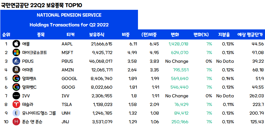 과연 국민연금 22Q2 보유종목 TOP10은 무엇일까요?