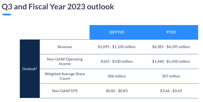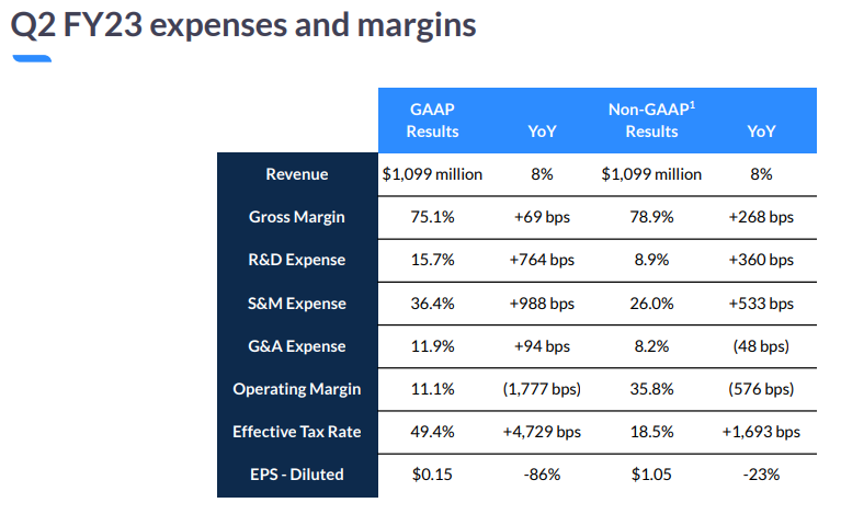 - 운영 및 운영 수익: 2022 회계연도 2분기 운영 수익 2억 9,460만 달러와 비교하여 2분기 운영 수익은 1억 2,170만 달러였습니다. 주식 기반 보상 비용 및 관련 급여세, 취득 관련 비용을 조정한 결과, 2분기 영업으로 인한 비GAAP 수입은 3억9,370만 달러였으며, 2022 회계연도 2분기 영업으로 인한 비GAAP 수입은 4억2,470만 달러였다. 2분기 GAAP 영업이익률은 11.1%, 비GAAP 영업이익률은 35.8%였다.