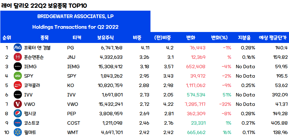 과연 레이 달리오의 브리지워터 22Q2 보유종목 TOP10은 무엇일까요?