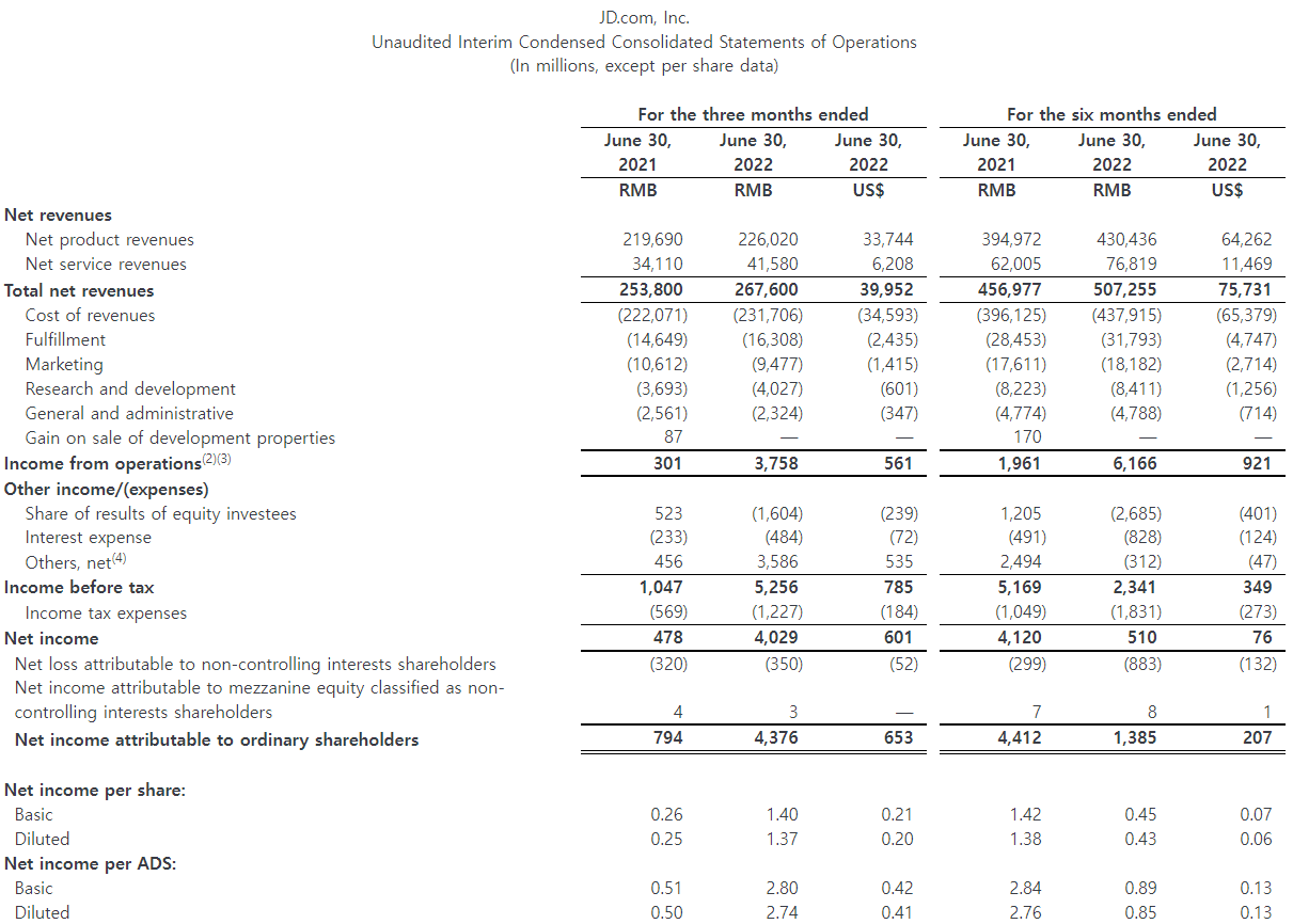 - 2022년 2분기 운영 수입은 38억 위안(미화 6억 달러)으로 지난해 같은 기간의 3억 위안과 비교된다. 2021년 2분기 25억 위안과 비교하여, 비GAAP 운영 수입은 2022년 2분기 58억 위안 (미화 9억 달러)이었다. JD리테일의 2022년 2분기 미할당 품목 전 영업이익률은 3.4%로 2021년 2분기 2.6%에 비해 높았다.