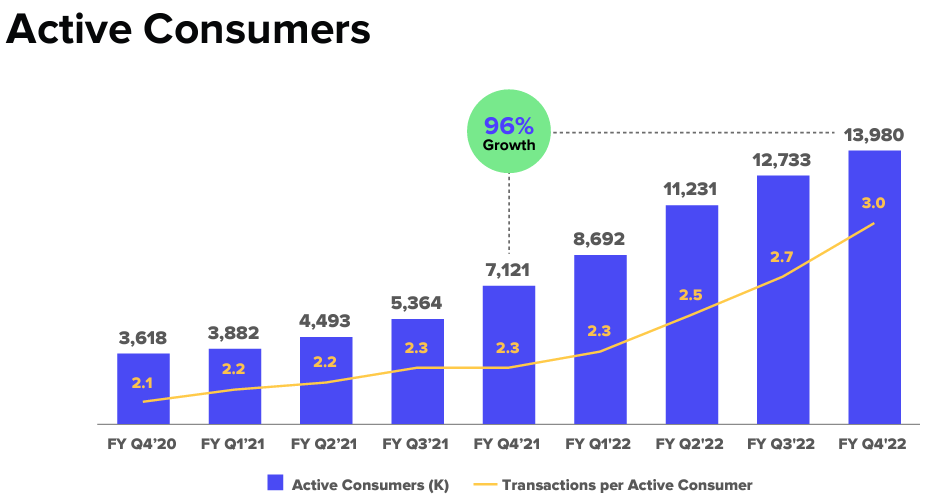 - 적극적 소비자는 2022년 3월 31일 기준 96% 증가한 1,400만 명, 순차적 기준으로 10%인 120만 명이 증가했다.- 해당 분기의 총 거래량은 139% 증가한 1,200만 건으로 증가했다.
