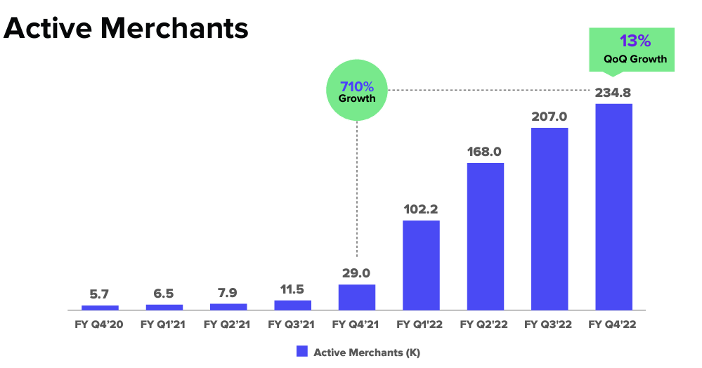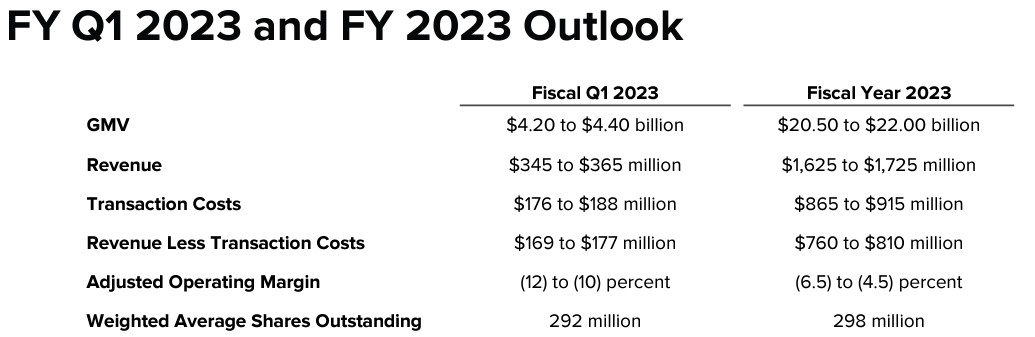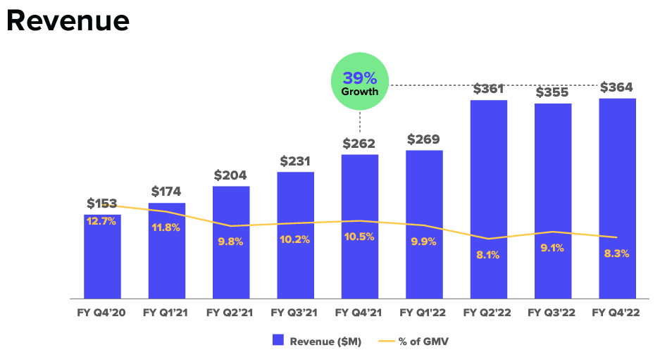 - 2022 회계연도 4분기 GMV는 77% 증가한 44억 달러, 2022 회계연도 GMV는 87% 증가한 155억 달러였다.