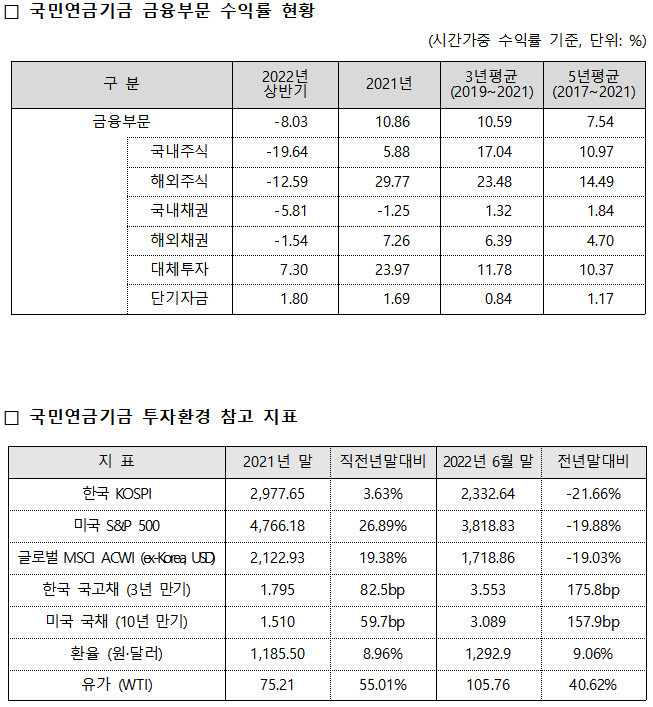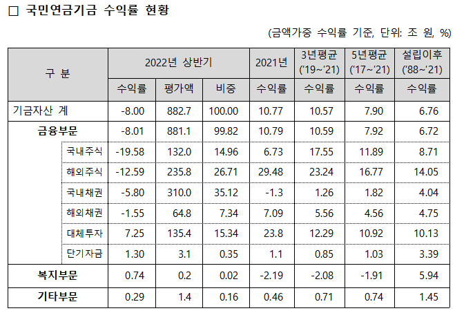 ✅올해 2분기까지 기금운용 수익률이 음(-)의 성과를 나타낸 것은 글로벌 주식·채권의 동반 약세로 손실 폭이 확대된 데 따른 것이다.