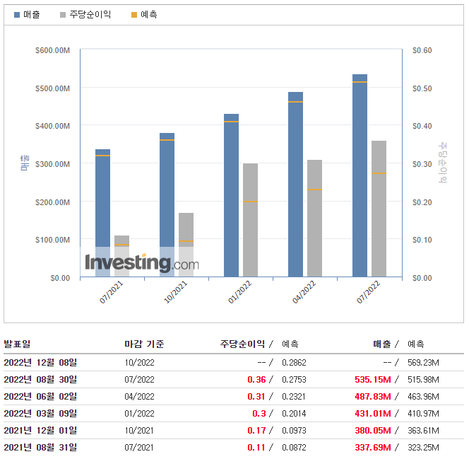- 매출: 총 수익은 5억 3,520만 달러로 2022 회계연도 2분기 3억 3,770만 달러에 비해 58% 증가했다. 구독 수익은 5억620만 달러로 2022 회계연도 2분기 3억1580만 달러에 비해 60% 증가했다.