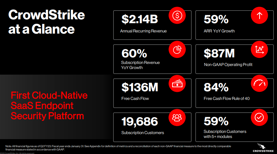 - 5개 이상, 6개 이상, 7개 이상 모듈을 채택한 크라우드스트라이크의 구독 고객은 2022년 7월 31일 기준 각각 59%, 36%, 20%였다.