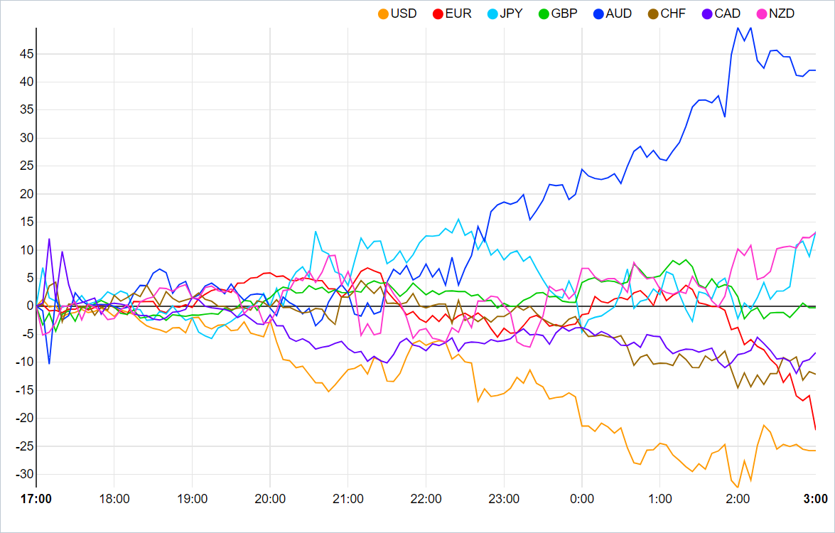 ✅통화 강도 차트: 가장 강함 - AUD, 가장 약함 - USD.